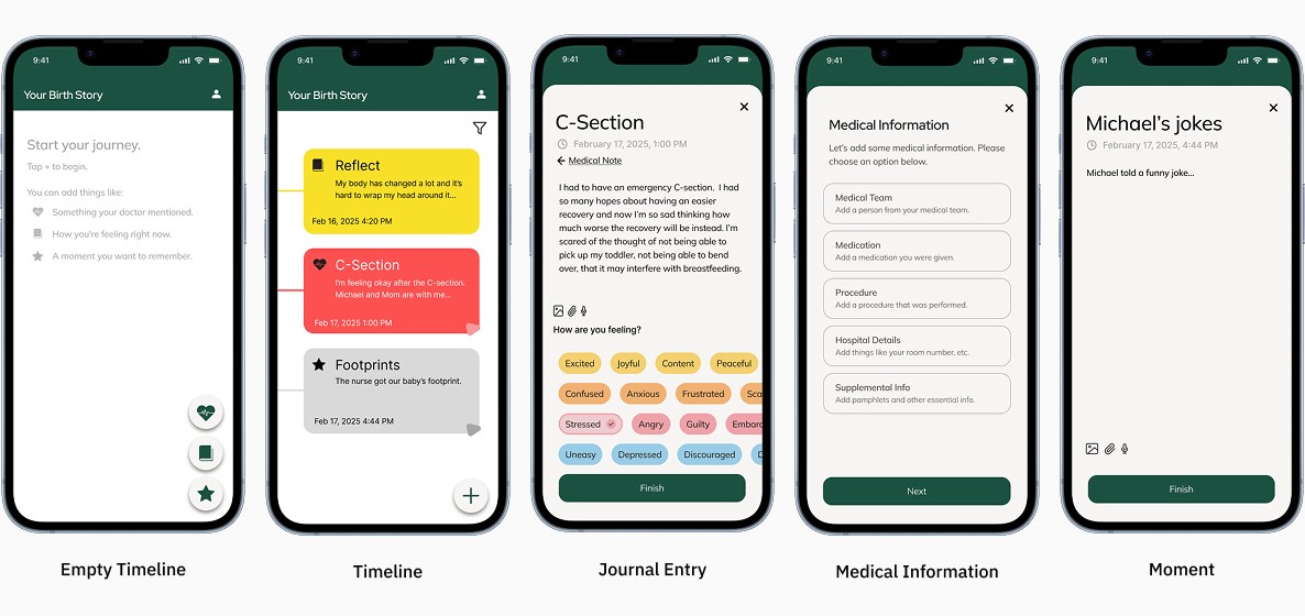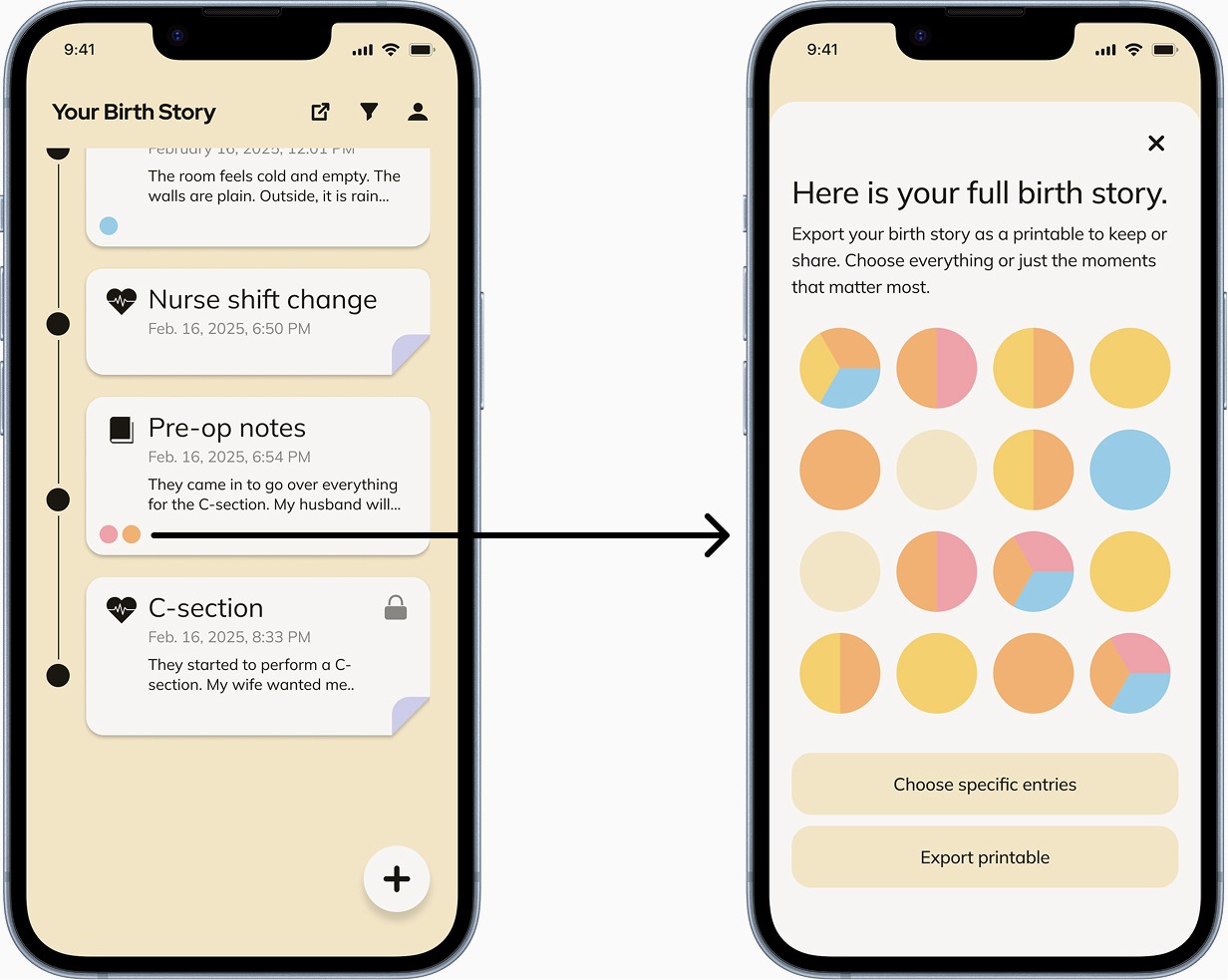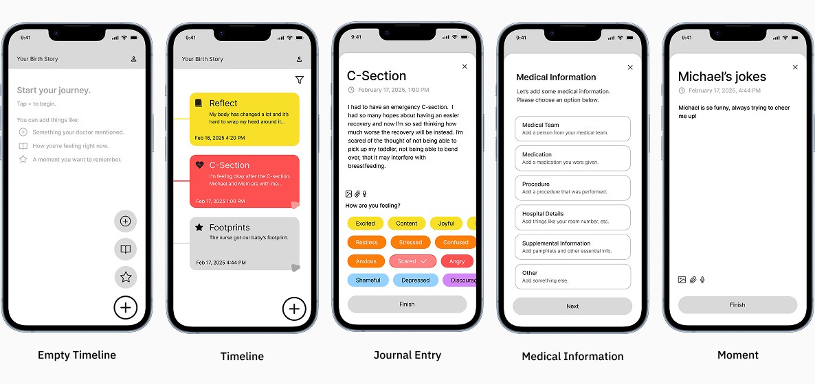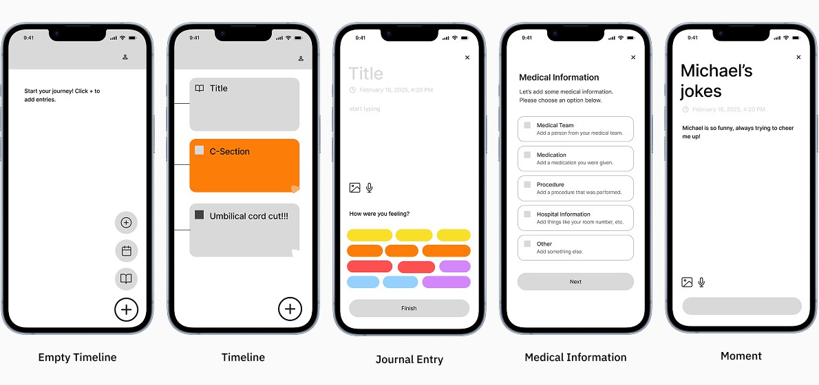 We created a timeline that combined journal entries, medical details, and quick “moments” for memory capture. These prototypes helped us test how parents might document their experience naturally, without interrupting the flow of labor and recovery.