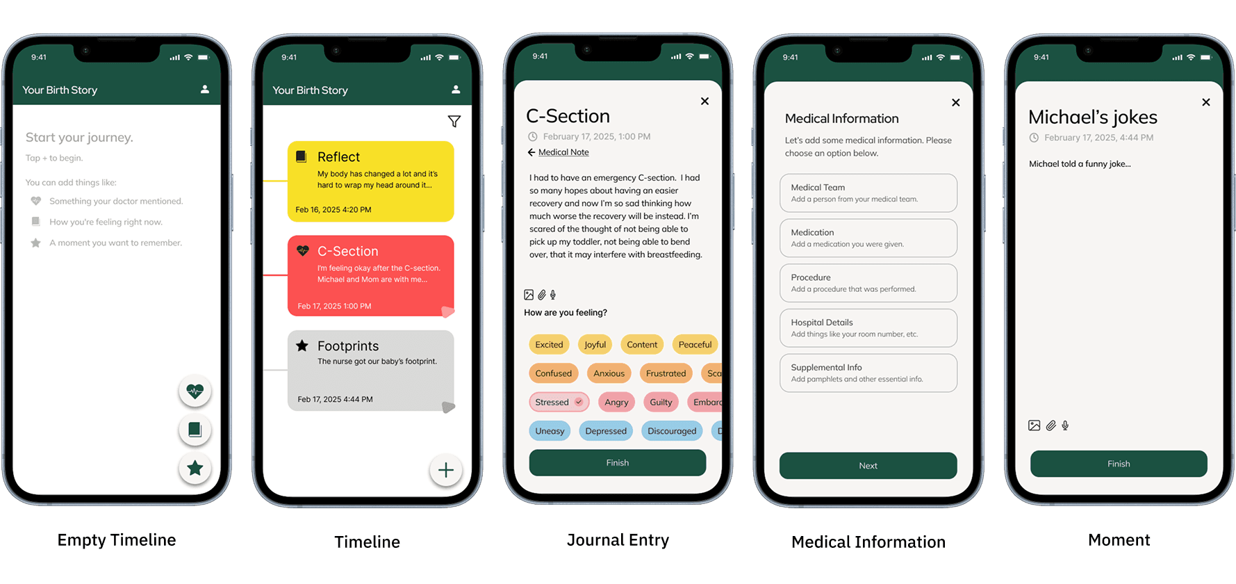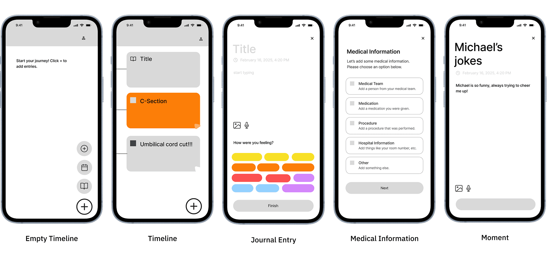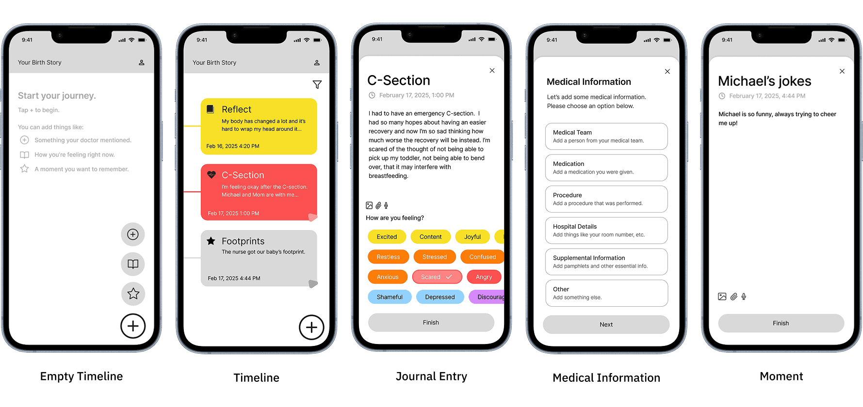 We created a timeline that combined journal entries, medical details, and quick “moments” for memory capture. These prototypes helped us test how parents might document their experience naturally, without interrupting the flow of labor and recovery.